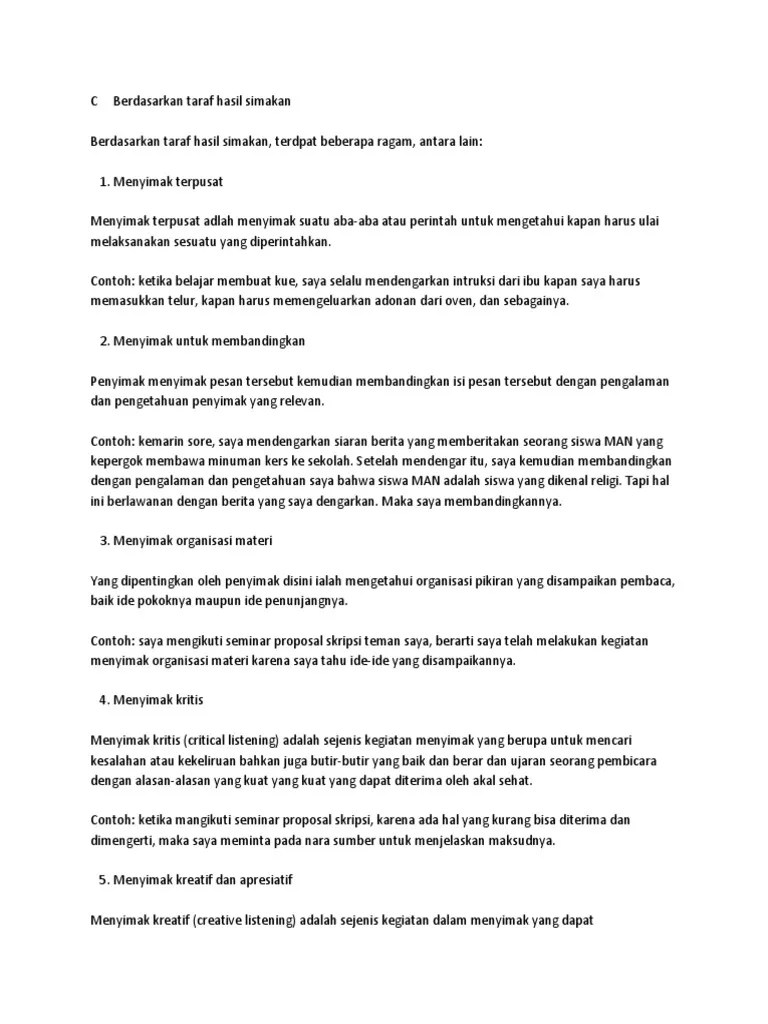 Pengertian menyimak menyimak adalah mendengar secara khusus dan terpusat pada objek yang disimak. Maka dengan demikian, menyimak bermakna mendengarkan dengan penuh b. Nofian pramujianto, 2102405618 peningkatan keterampilan menyimak wacana percakapan bahasa jawa menggunakan media vcd ginem jawi dengan pendekatan. Menyimak dapat didefinisikan suatu aktivitas yang mencakup kegiatan mendengar dan bunyi bahasa, mengidentifikasi, menilik, dan. Keterampilan menyimak dalam keterampilan menyimak akan dibahas mengenai: